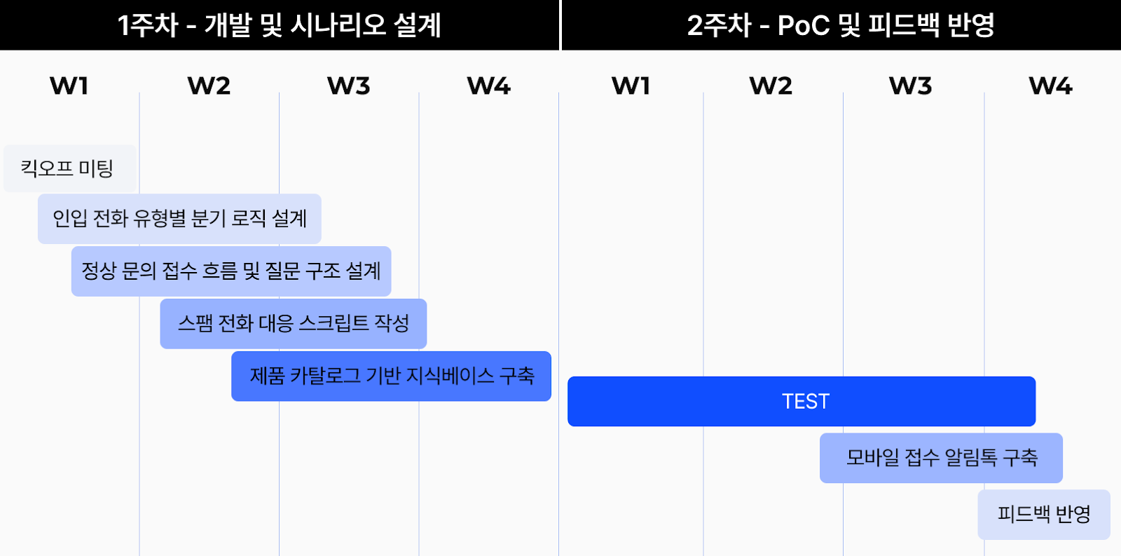 AI 상담 시스템 구축은 총 2주간 진행되었으며, 빠른 구현과 동시에 실전 검증을 병행하는 단계적 접근을 취했습니다.